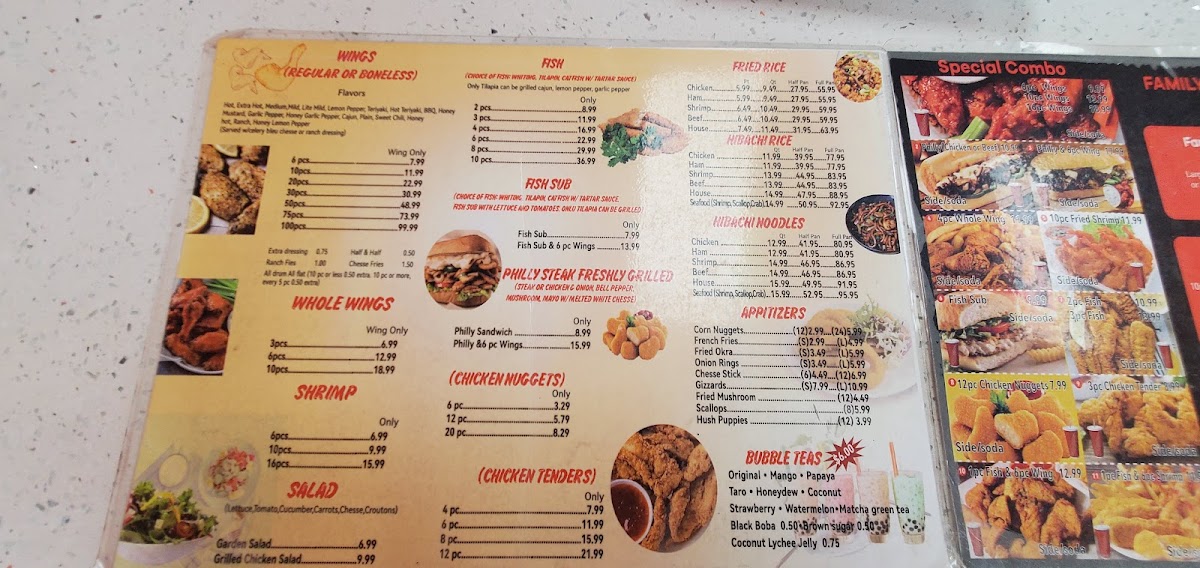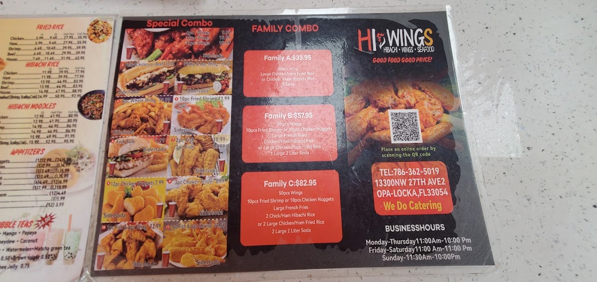 If you’re craving a little bit of everything, the Hi Wings Hibachi Wings Seafood Menu is the place to get your taste buds dancing. From crispy, saucy wings that hit just the right level of spice to fresh seafood dishes that feel like a mini seaside escape, every option promises something satisfying. The hibachi selections are a fun twist, sizzling right on the grill and bursting with flavor, while the sides and appetizers make it easy to mix and match for a perfect meal. Whether you’re in the mood for a hearty plate of wings with bold sauces, tender shrimp, or a combination of both, this menu keeps things exciting without ever feeling overwhelming. It’s the kind of spread that works whether you’re grabbing lunch on the go, settling in for dinner with friends, or just hunting for that next crave-worthy bite in Opa-locka. The variety is spot-on, letting you build a meal that’s as adventurous or as classic as you like, all in one convenient spot at 13300 NW 27th Ave.